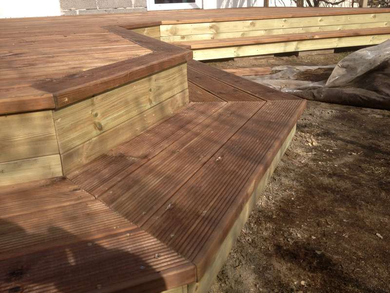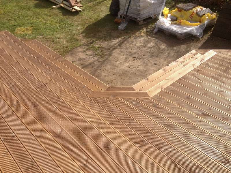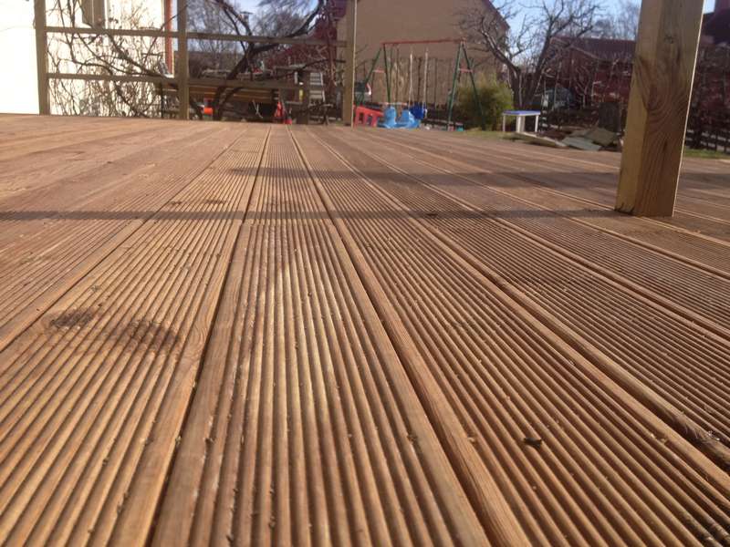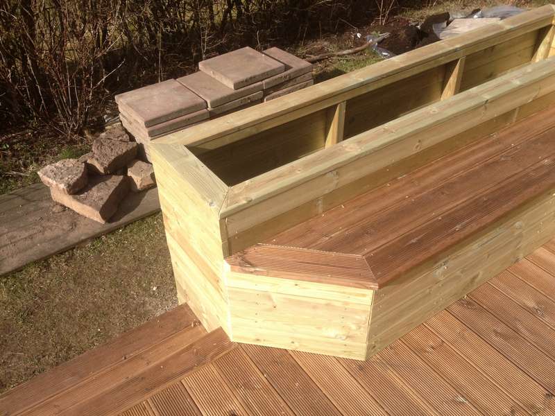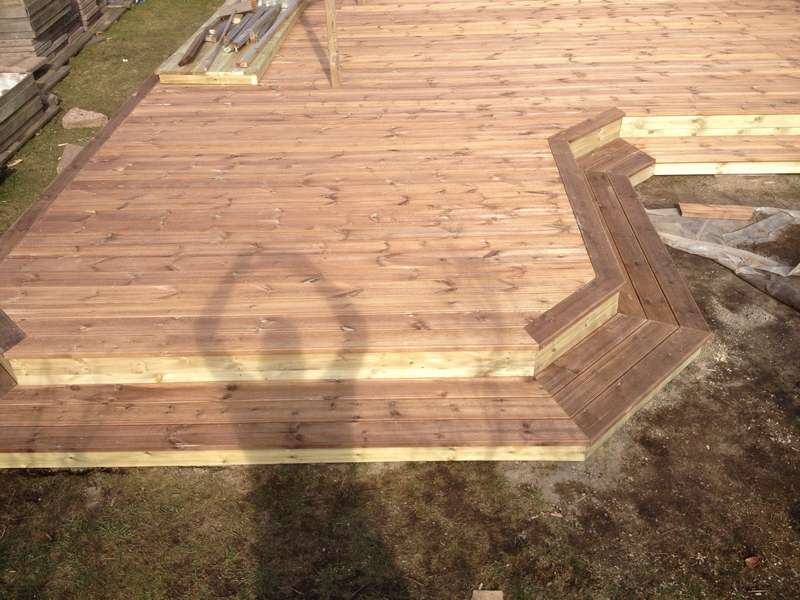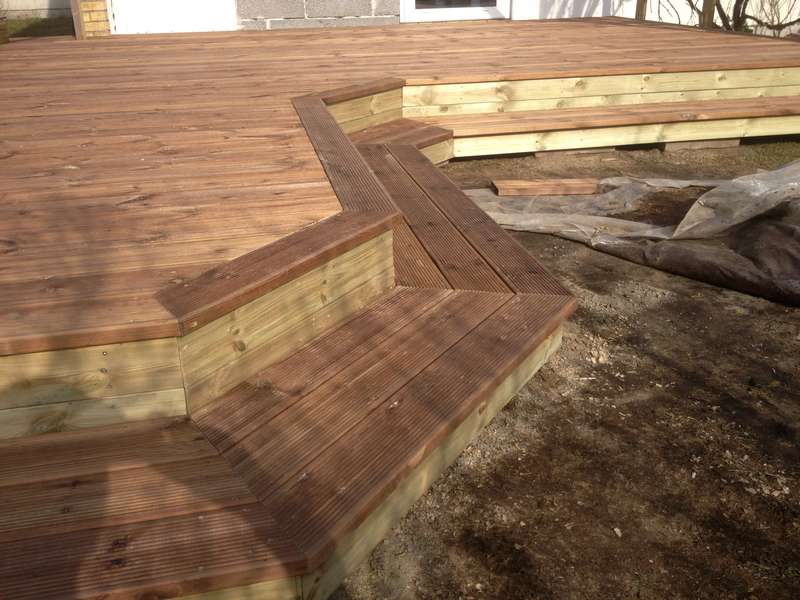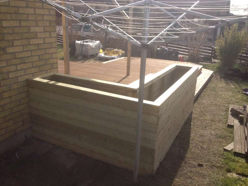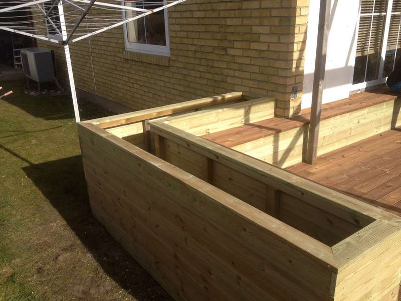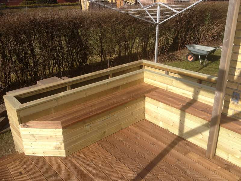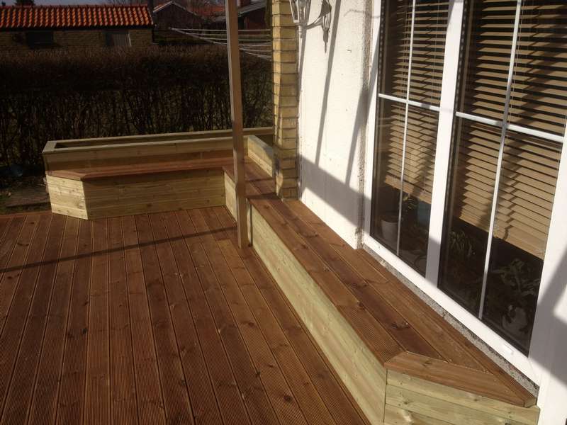en snygg terass med blomlådor runt sittplatsen. Vi använde räfflade brädor, vilket gav terassen ett