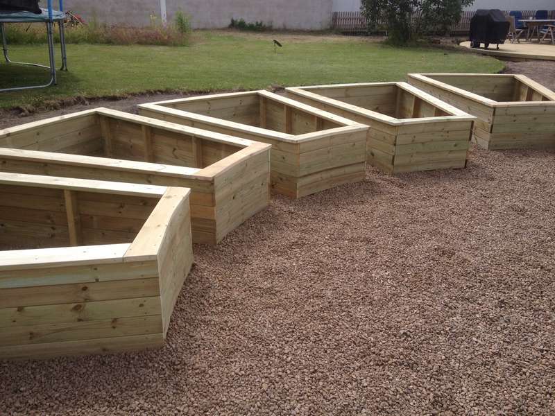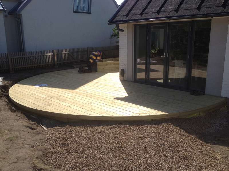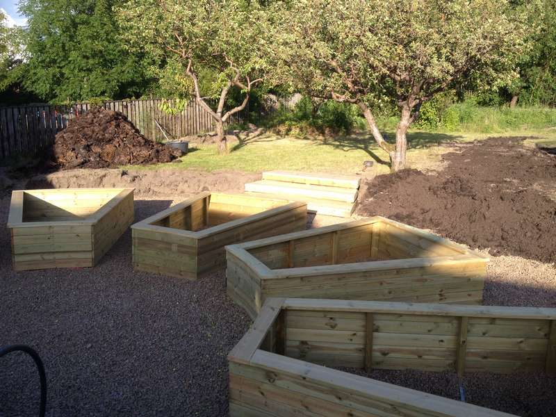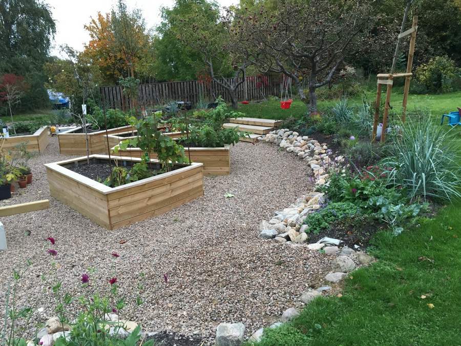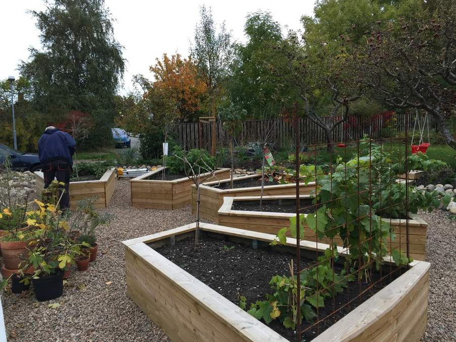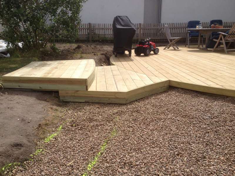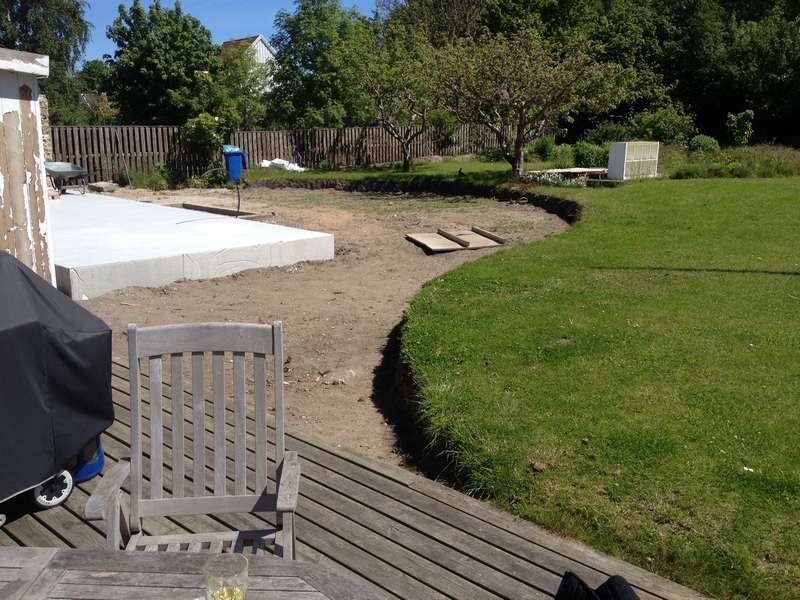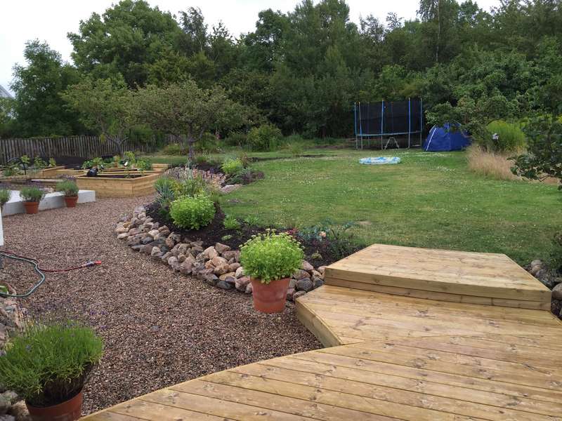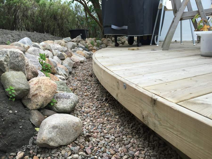I det här arbetet i Lomma, lät vi designen präglas av runda former. En stor, rund terass med trappor kompletterade vi med runda blomlådor utställda i en halvcirkel.