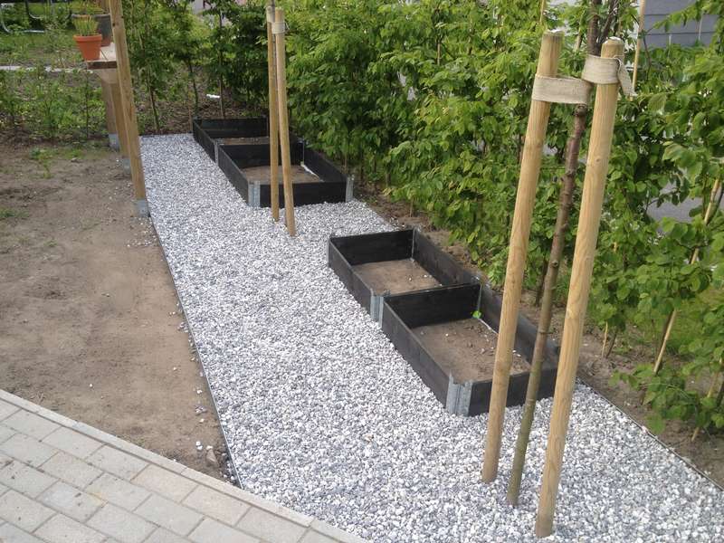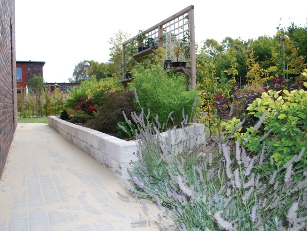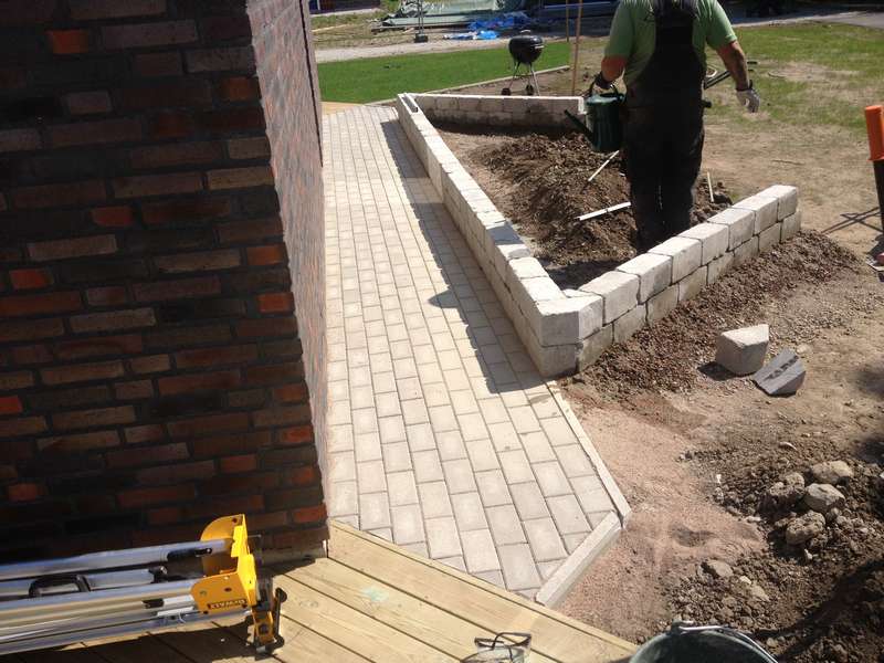 gångar som kopplar ihop dem. Vi skapade även en stor blomlåda med stödmur, och för att avsluta trädgården